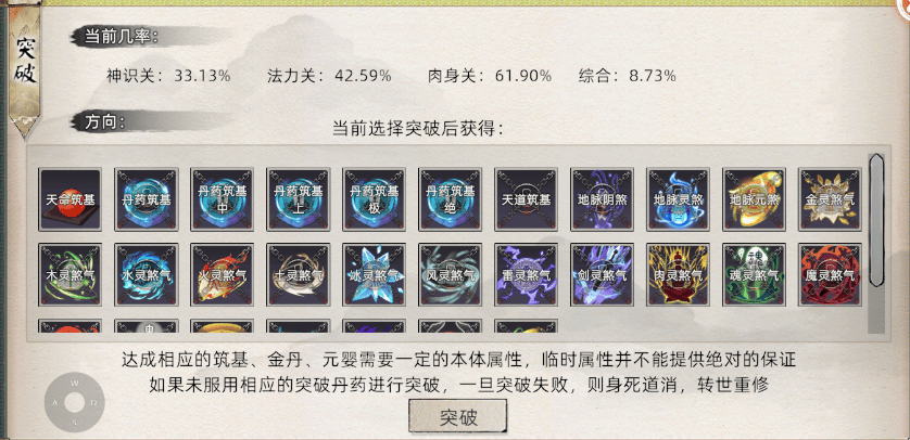 特殊突破:雷灵根选雷劫锻体(肉身 + 30%),天命筑基(功德 + 20%)。
