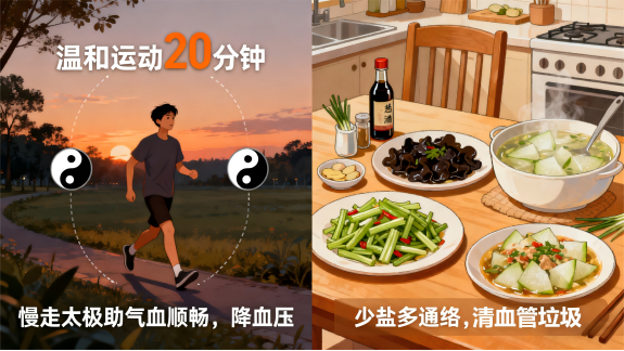 每天 “温和运动20分钟”:选慢走、太极这类温和的运动,每天傍晚练 20 分钟,速度以不喘、血压不骤升为度,既能帮着降血压,又能让气血顺畅运行;赵叔坚持慢走1个月后,头晕手麻的次数少了很多。