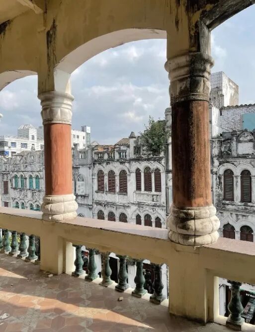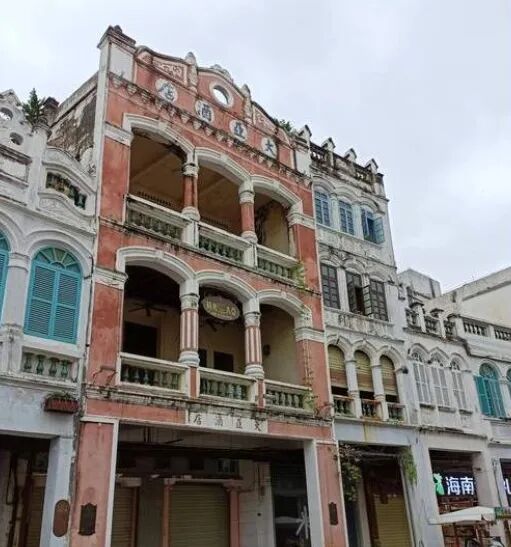 “五层楼”占地面积2000平方米,从1935年建成后的28年内,都是海口地标,集影剧院、宾馆、高档商业和酒楼于一身。它外立面是典型欧洲巴洛克风格:罗马立柱,半圆窗;屋顶的外立面是女儿墙,如波浪般起伏,有奔放流动的视觉冲击力。底层却融合南洋风情,店铺前是开敞的廊柱,便于遮阳防雨。