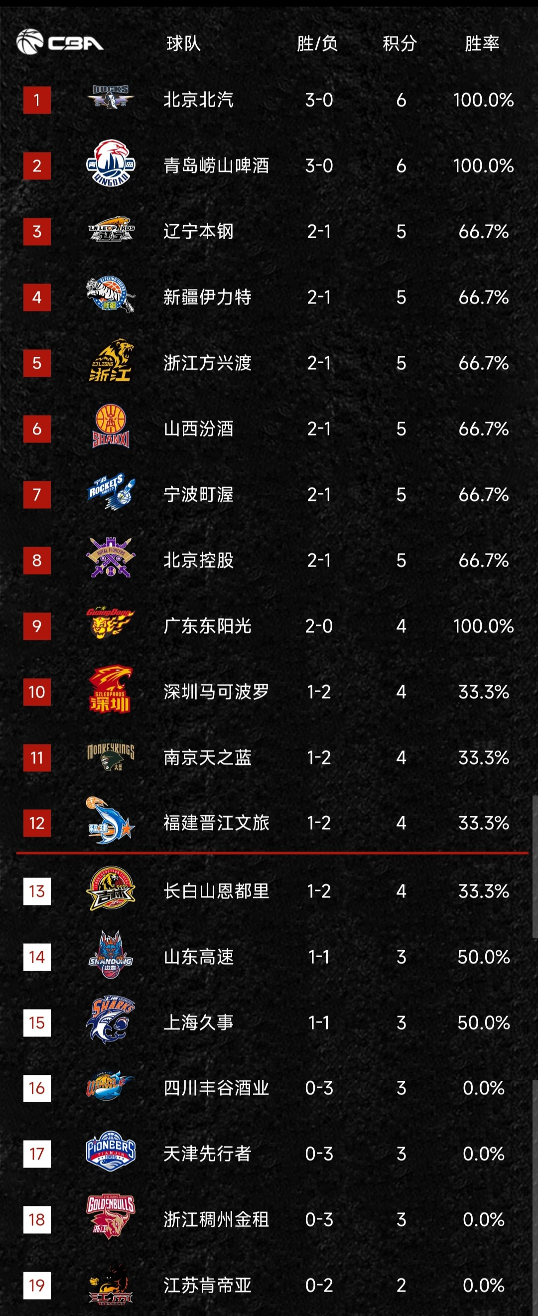 以上就是CBA最新的积分榜单,虽然第三轮比赛还没有打完,但就目前的情况而言,各支球队的战绩确实能说明很多问题。大家对于各球队的排名有什么看法呢?