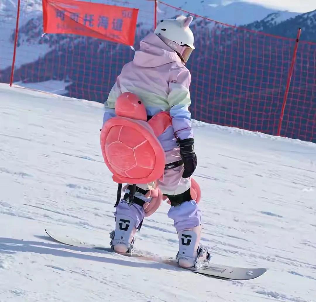 鞋子也穿着同色系的粉色滑雪鞋,少女的颜色,膝盖和屁股也带着粉色的小乌龟玩偶,看来小乌龟确实是婵宝的心头好。