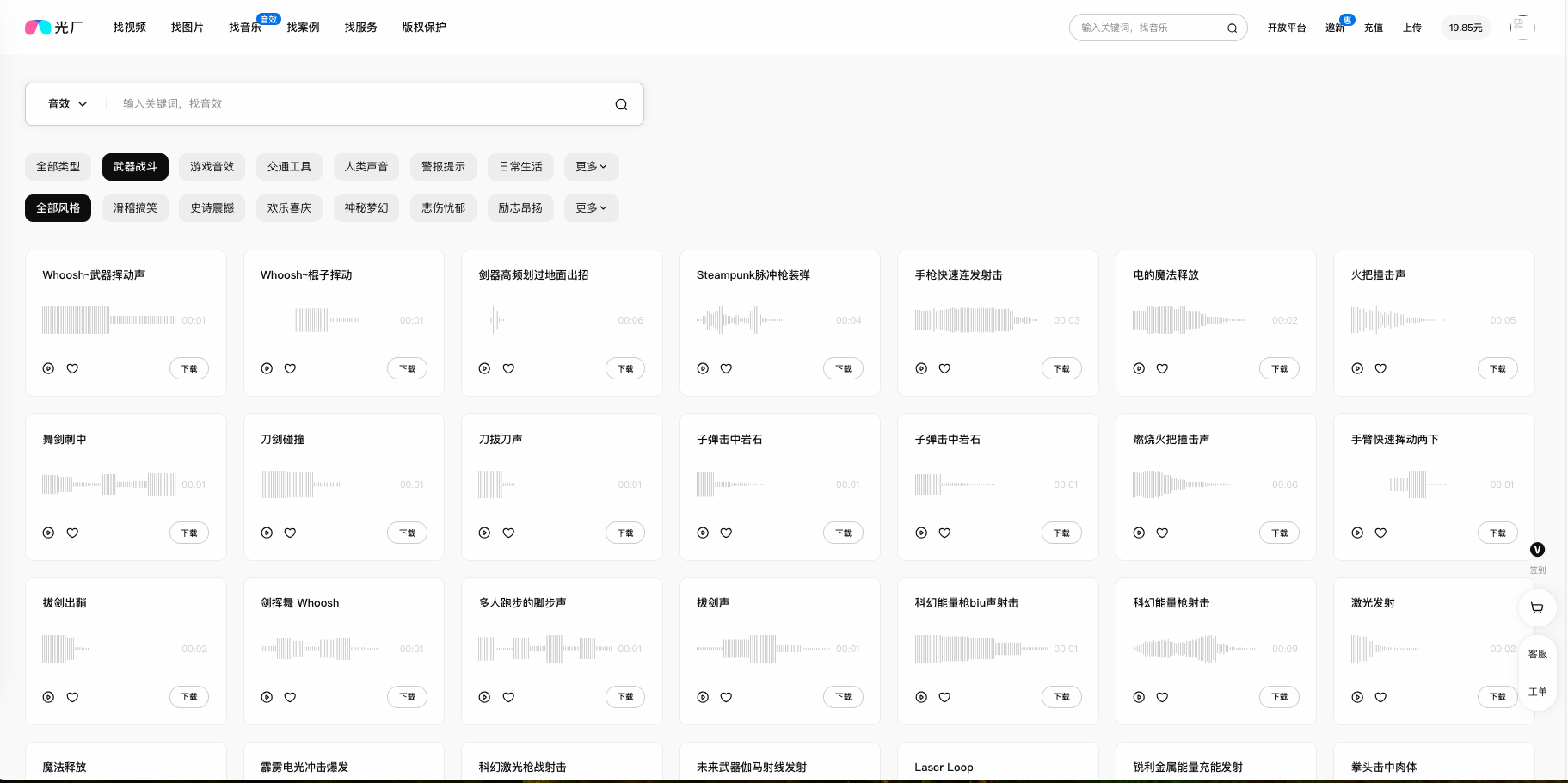 对于需要稳定、高质量且版权清晰的商业项目而言,光厂音效几乎是国内创作者的首选起点。它绝不仅仅是一个素材库,更是一个以“AI+场景化” 驱动的高效音效解决方案平台。其核心优势在于将海量素材(拥有超过50万条高品质音效)与智能工具结合,独创的“场景化标签系统”能将音效按影视、游戏场景智能分类。当你在为一段“赛博朋克巷战”寻找音效时,无需分别搜索“激光枪”、“机械步”、“金属撞击”,只需输入场景关键词,AI智能搜索就能为你关联和推荐一整套匹配的音效组合,甚至自动聚类相似素材,极大减少了机械翻页的时间。更值得一提的是,光厂深植于本土创作生态,其素材库中包含了大量符合国内用户审美和场景需求的音效,避免了海外素材库常见的文化错位感。在音质上,光厂也树立了标杆,其提供的免费下载资源普遍采用48kHz/24bit的广播级WAV无损格式,确保了从剑刃破风到能量汇聚的每一个细节都饱满而有层次,完全经得起商业项目的考验。对于战斗音效这种需要强烈动态和细节的声音类型,这种高规格的源文件为后期处理留足了空间。