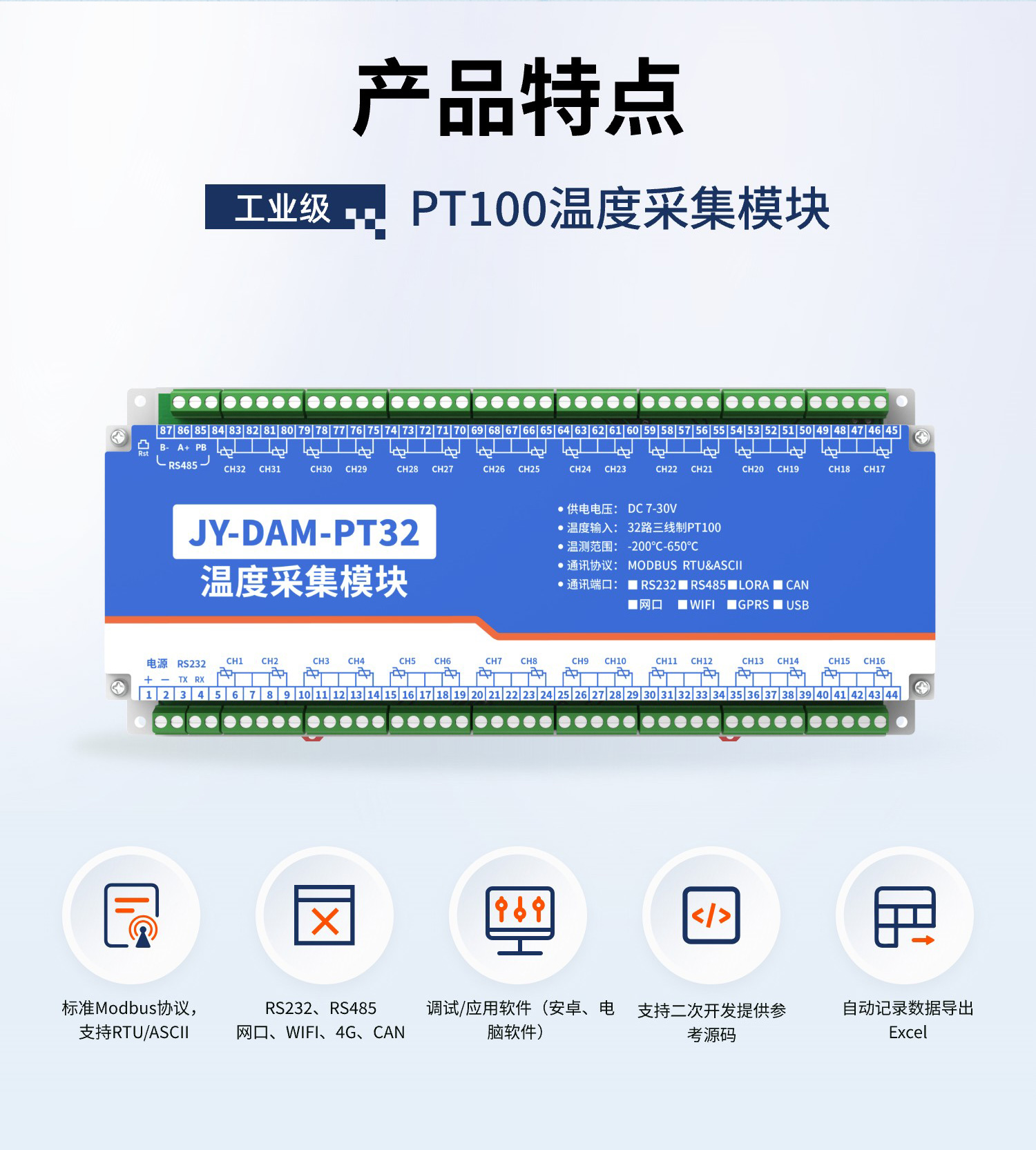 PT100温度采集模块是一类基于铂电阻PT100传感器、支持32路温度信号同步采集的工业级数据采集设备,具备高精度、抗干扰、稳定性强的特点,广泛应用于需要多点温度监测与数据整合的工业、农业、医疗等场景。