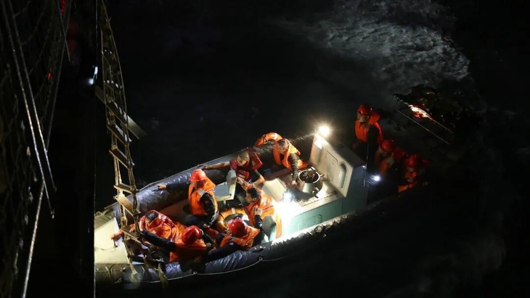 经过一番颠簸,救生小艇终于安全靠回扬州舰,舰上的官兵们早已在甲板上等候,看到小艇回来,立刻上前接应,小心翼翼地将渔民们扶上舰艇。对于这些惊魂未定的渔民来说,踏上中国军舰的那一刻,紧绷的神经才稍稍放松下来,他们知道,自己终于安全了。但由于夜间气温极低,海水冰冷刺骨,加上他们身上只穿了少量衣物,不少人冻得脸色发白,身体不停瑟缩。