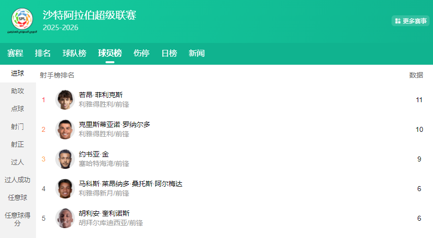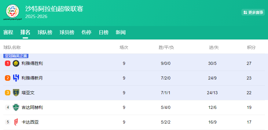 截止北京时间12月24日,沙特联赛共进行9轮联赛C罗率领的利雅得胜利,保持全胜,排在联赛第一。