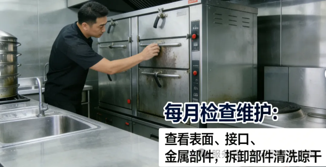 2. 每月检查维护:查看设备表面是否有划痕、变形,接口是否松动,金属部件是否有锈蚀迹象;对于可拆卸部件(如蒸箱托盘、水槽滤网),拆卸后彻底清洗晾干再安装。