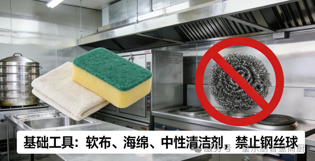 ✅ 基础工具:软布、海绵、中性清洁剂(如洗洁精)是首选!禁止用钢丝球、硬毛刷,会刮花不锈钢表面,破坏防护层,反而更容易生锈。