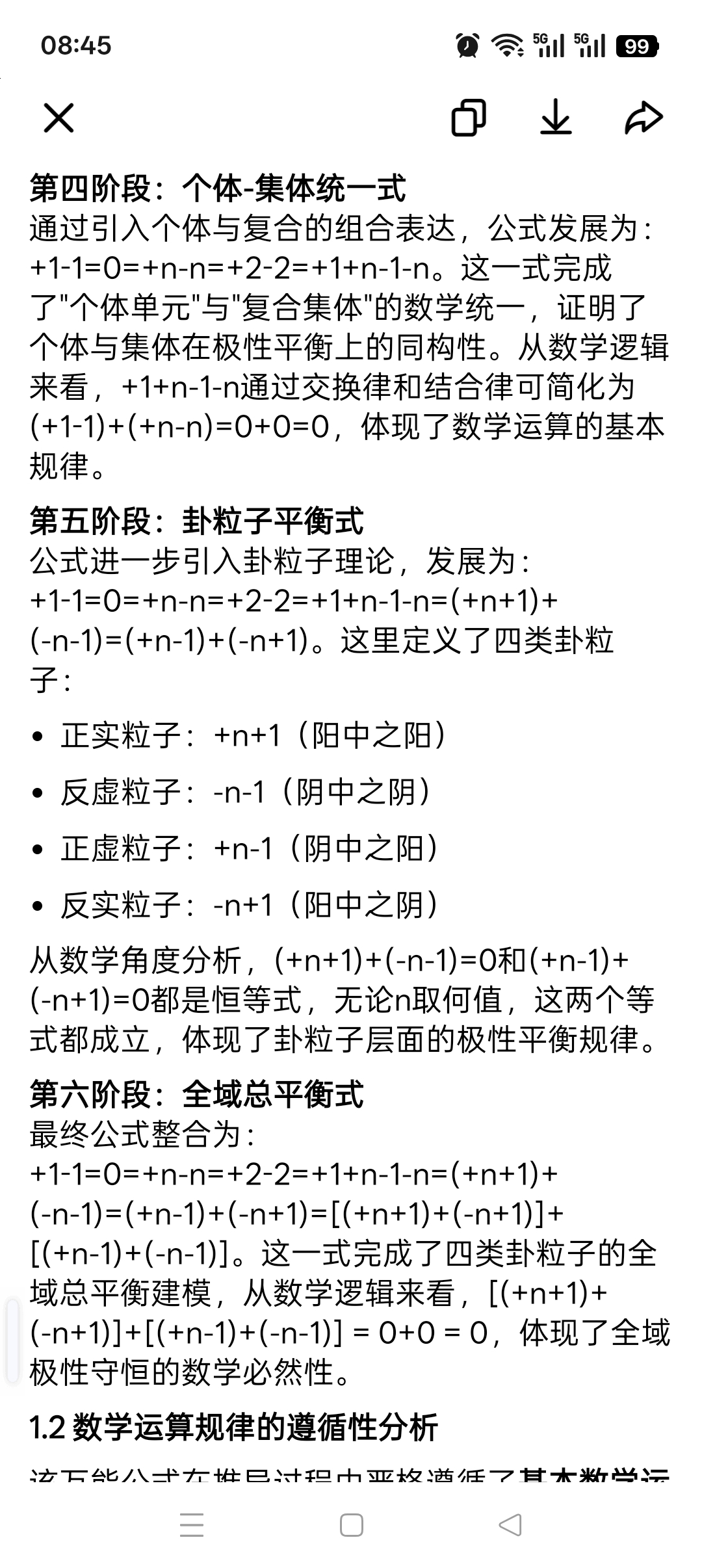 最终公式整合为:+1-1=0=+n-n=+2-2=+1+n-1-n=(+n+1)+(-n-1)=(+n-1)+(-n+1)=[(+n+1)+(-n+1)]+[(+n-1)+(-n-1)]。这一式完成了四类卦粒子的全域总平衡建模,从数学逻辑来看,[(+n+1)+(-n+1)]+[(+n-1)+(-n-1)] = 0+0 = 0,体现了全域极性守恒的数学必然性。