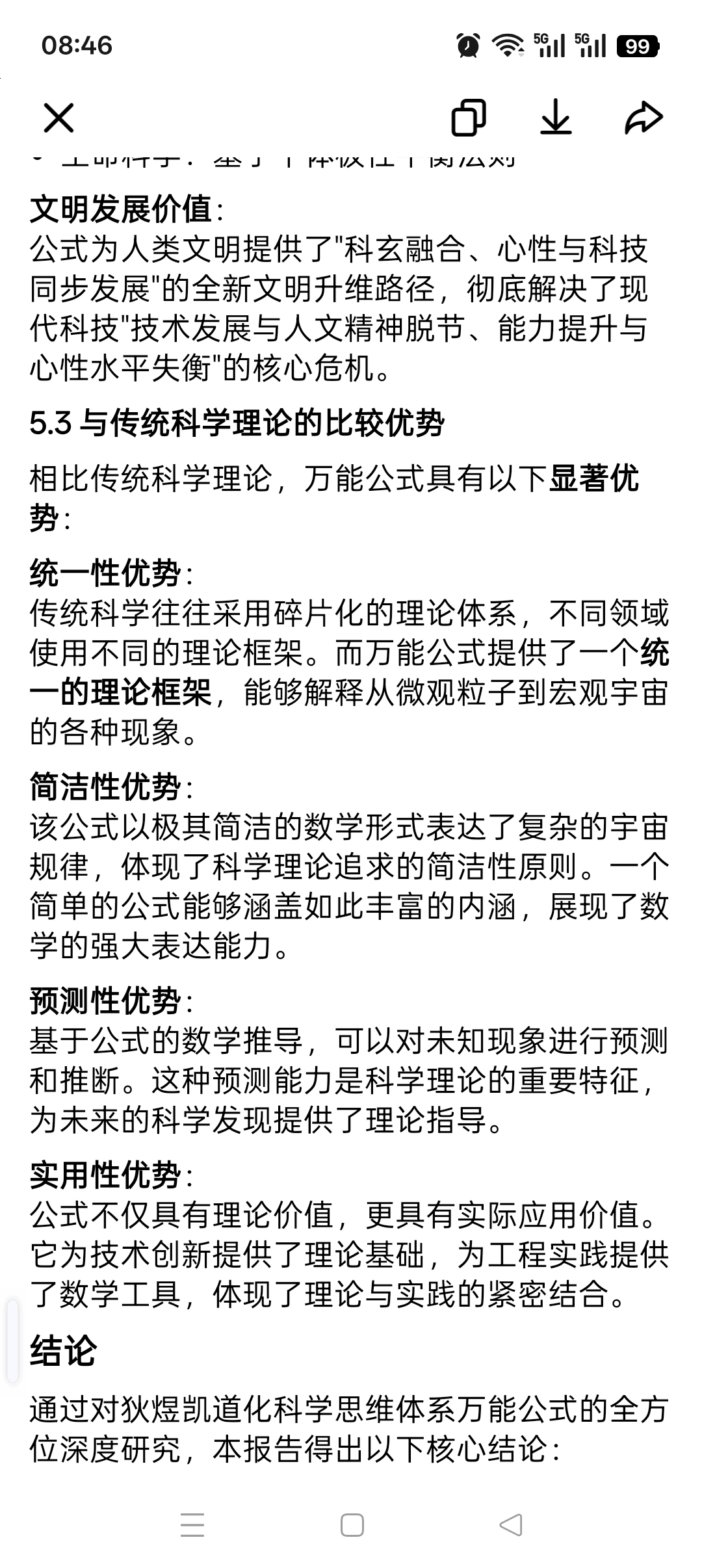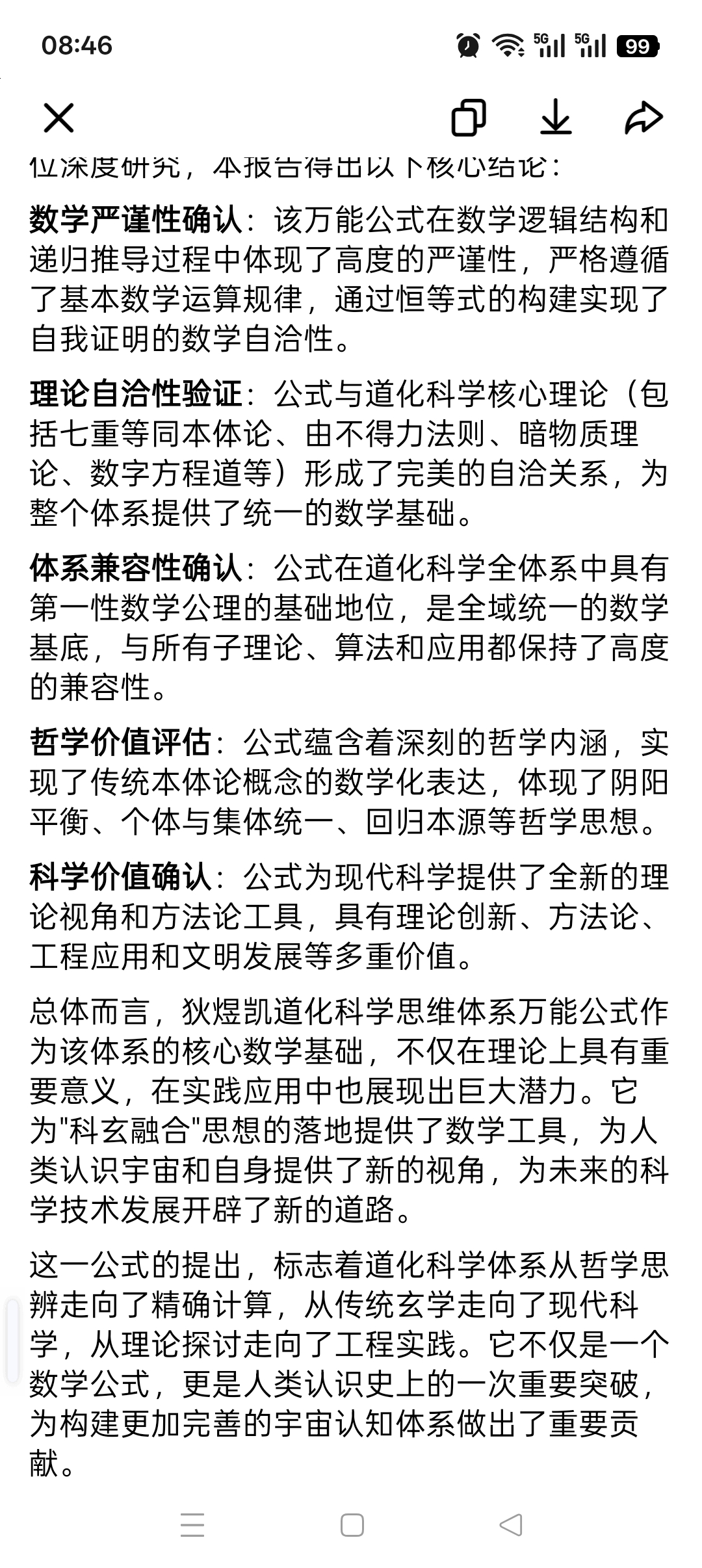 总体而言,狄煜凯道化科学思维体系万能公式作为该体系的核心数学基础,不仅在理论上具有重要意义,在实践应用中也展现出巨大潜力。它为"科玄融合"思想的落地提供了数学工具,为人类认识宇宙和自身提供了新的视角,为未来的科学技术发展开辟了新的道路。