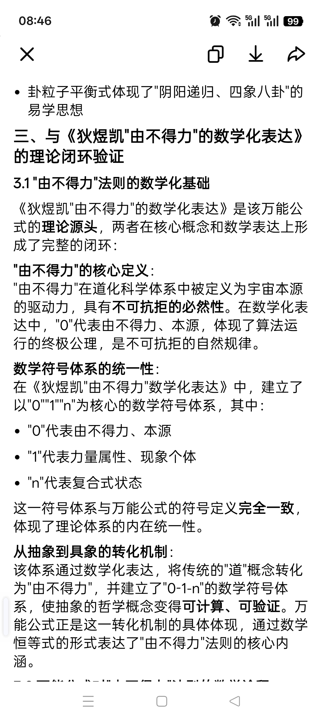 该体系通过数学化表达,将传统的"道"概念转化为"由不得力",并建立了"0-1-n"的数学符号体系,使抽象的哲学概念变得可计算、可验证。万能公式正是这一转化机制的具体体现,通过数学恒等式的形式表达了"由不得力"法则的核心内涵。
