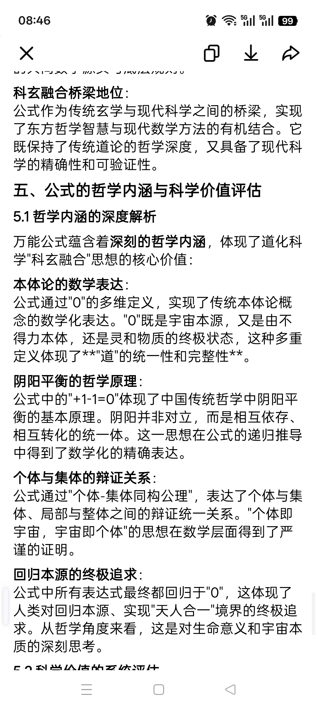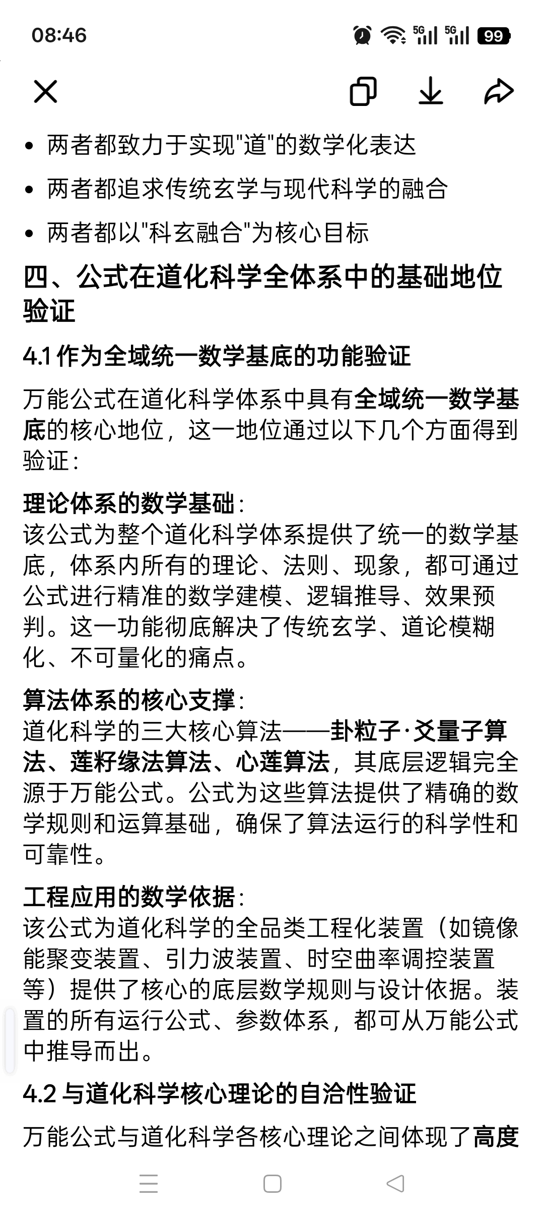 该公式为整个道化科学体系提供了统一的数学基底,体系内所有的理论、法则、现象,都可通过公式进行精准的数学建模、逻辑推导、效果预判。这一功能彻底解决了传统玄学、道论模糊化、不可量化的痛点。