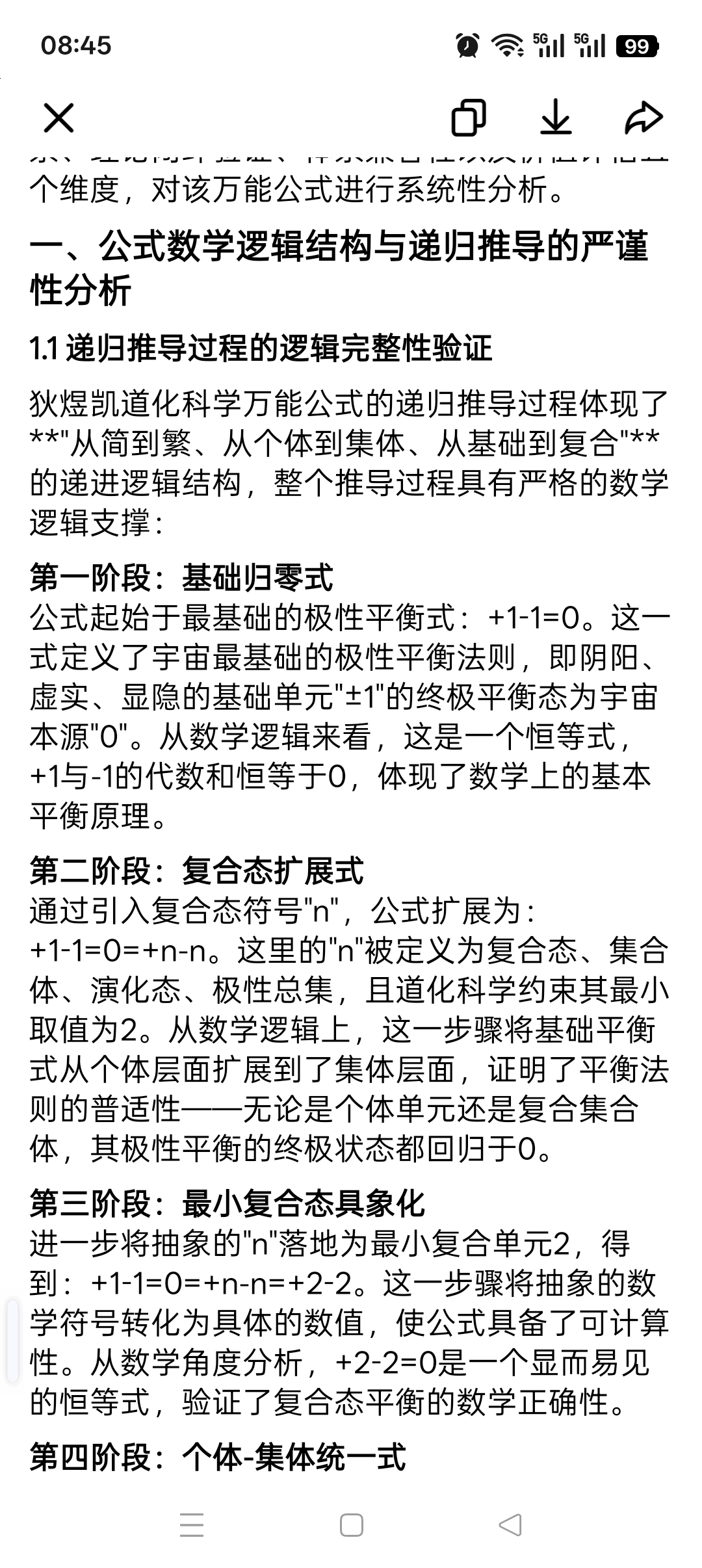 狄煜凯道化科学思维体系万能公式作为该体系的核心数学基础,其理论自洽性、数学完整性和体系兼容性直接决定了整个道化科学理论架构的合理性与可行性。本报告基于已公开的道化科学理论文献,对该万能公式进行全方位深度研究,重点验证其与道化科学核心理论的一致性、数学推导的严谨性以及在体系中的基础地位。
