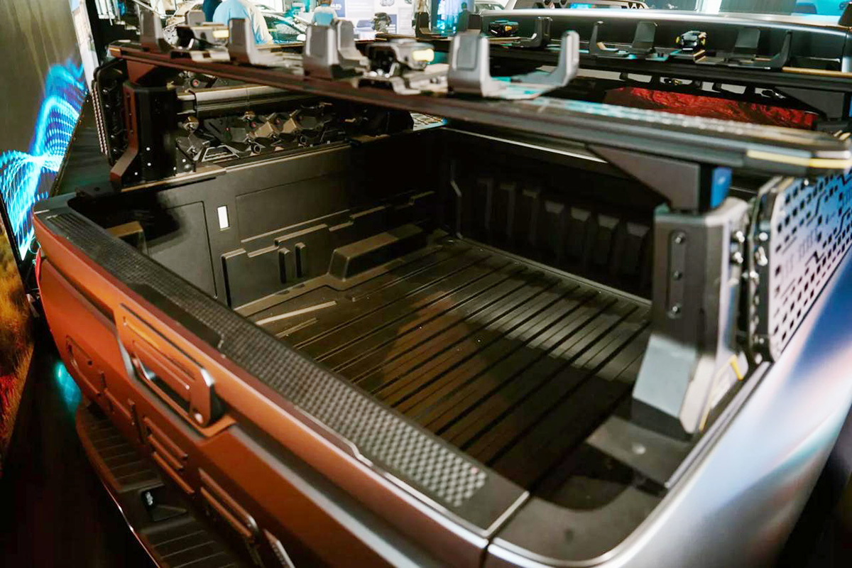此次亮相的实车后部还提供了拓展件,包括脱困板、置物架等,另外其车厢内底部是解决纯平的设计,有着不错的实用性。