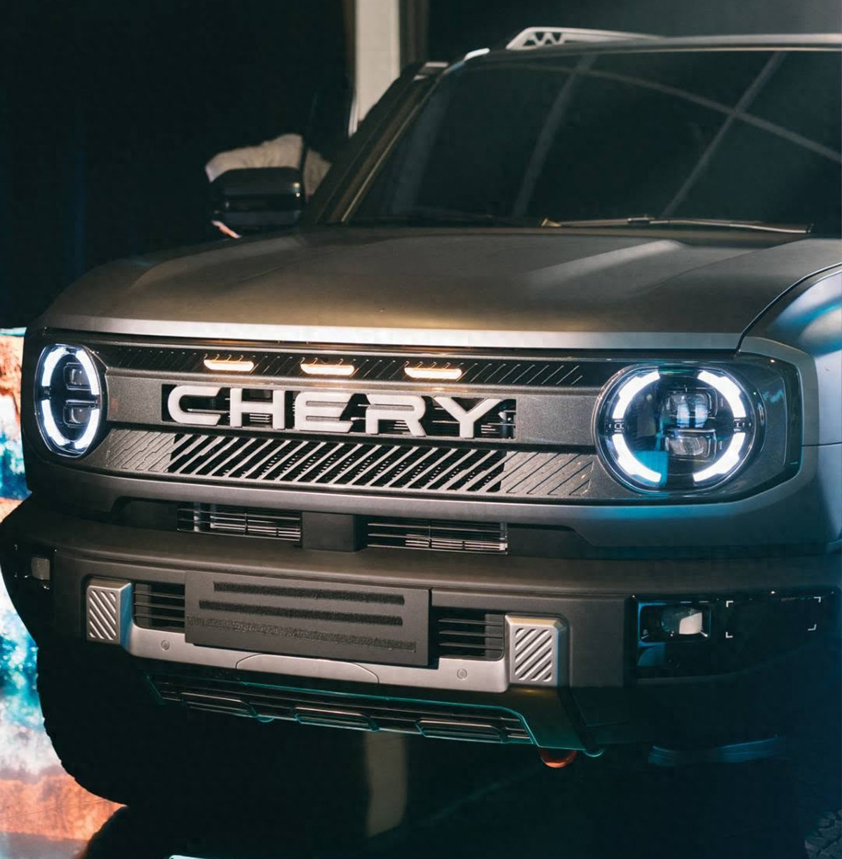 新车前脸造型很粗狂,使用了圆形的灯组设计,中网格栅为黑色涂装,和此前成都车展亮相的版本不同,中网上的车标换上了奇瑞品牌的字母拼音标识。