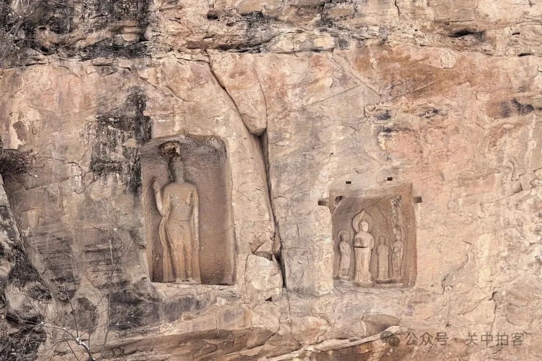站在铁丝网外,抬头仰望石窟,在东西长约40米的崖壁上,十九个佛龛排列于东段、中段、西段。其中,东段坐北朝南,分为上下四层,有13龛49尊造像;中段坐西朝东,位于中间的折角处,隐藏着2龛7尊造像;西段坐北朝南,散布着4龛9尊造像。