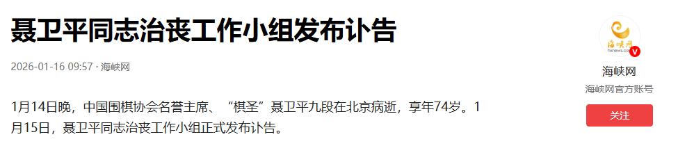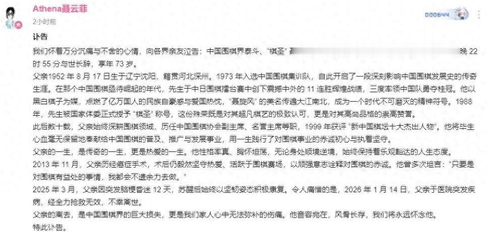 1月15日凌晨,聂卫平女儿在社交平台发布讣告,字字令人心痛落泪。