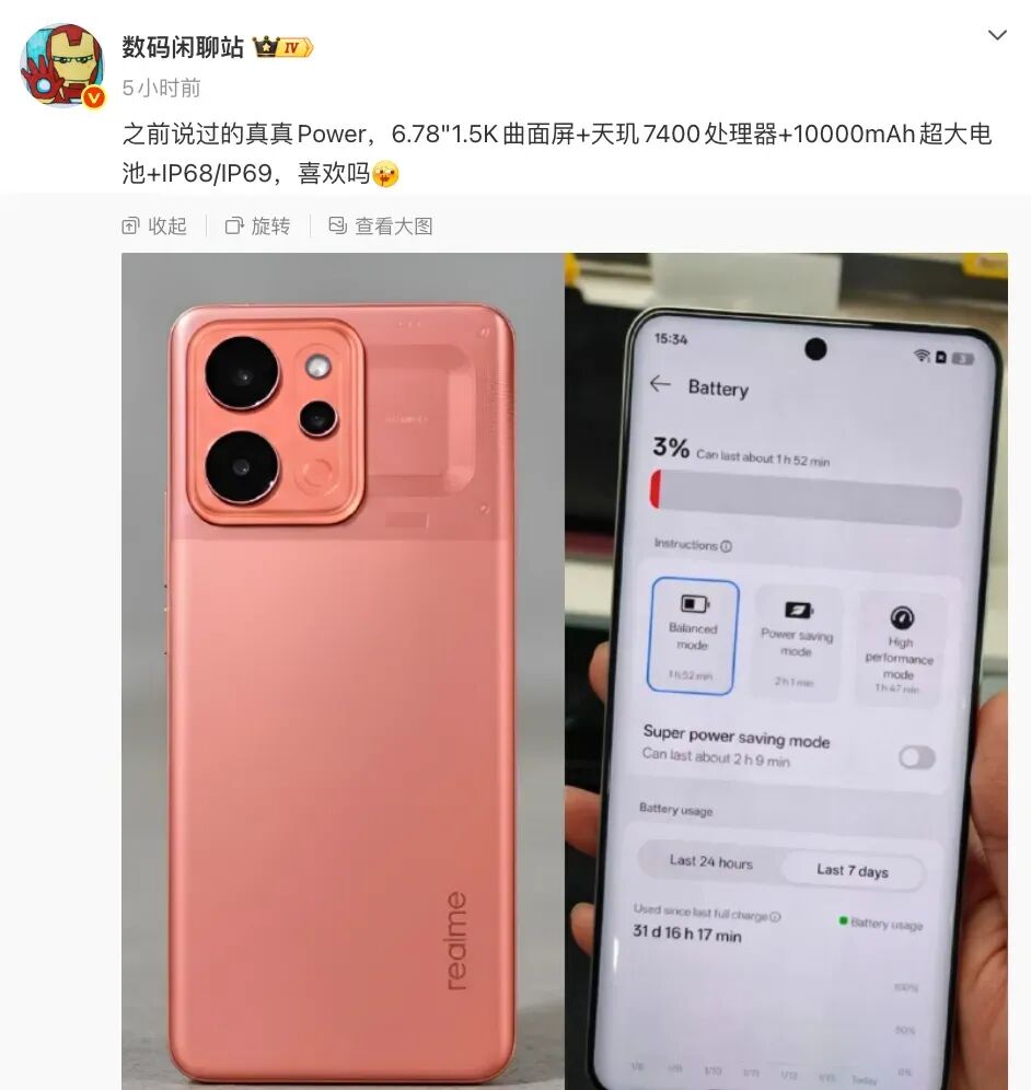 参考来看,这款真我 Power 手机将配备6.78英寸1.5K曲面屏,核心搭载天玑7400处理器,内置10000mAh超大电池,支持IP68/IP69防尘抗水。