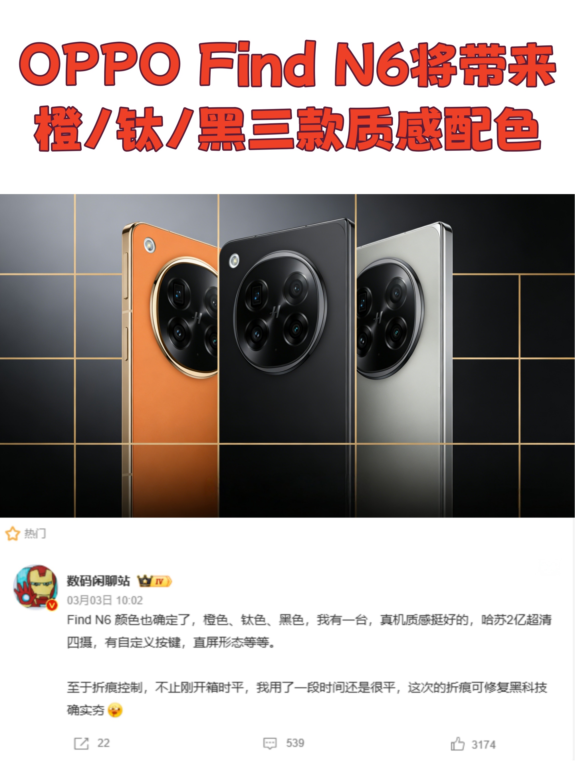 除此之外,根据站哥的最新透露,Find N6这次还提供了橙色、钛色以及黑色三款全新配色。尤其是橙色看起来非常靓丽时尚,很有高级质感。再加上哈苏2亿四摄、超大电池、AI手写笔等亮点,算是颜值与配置全都拉满了。