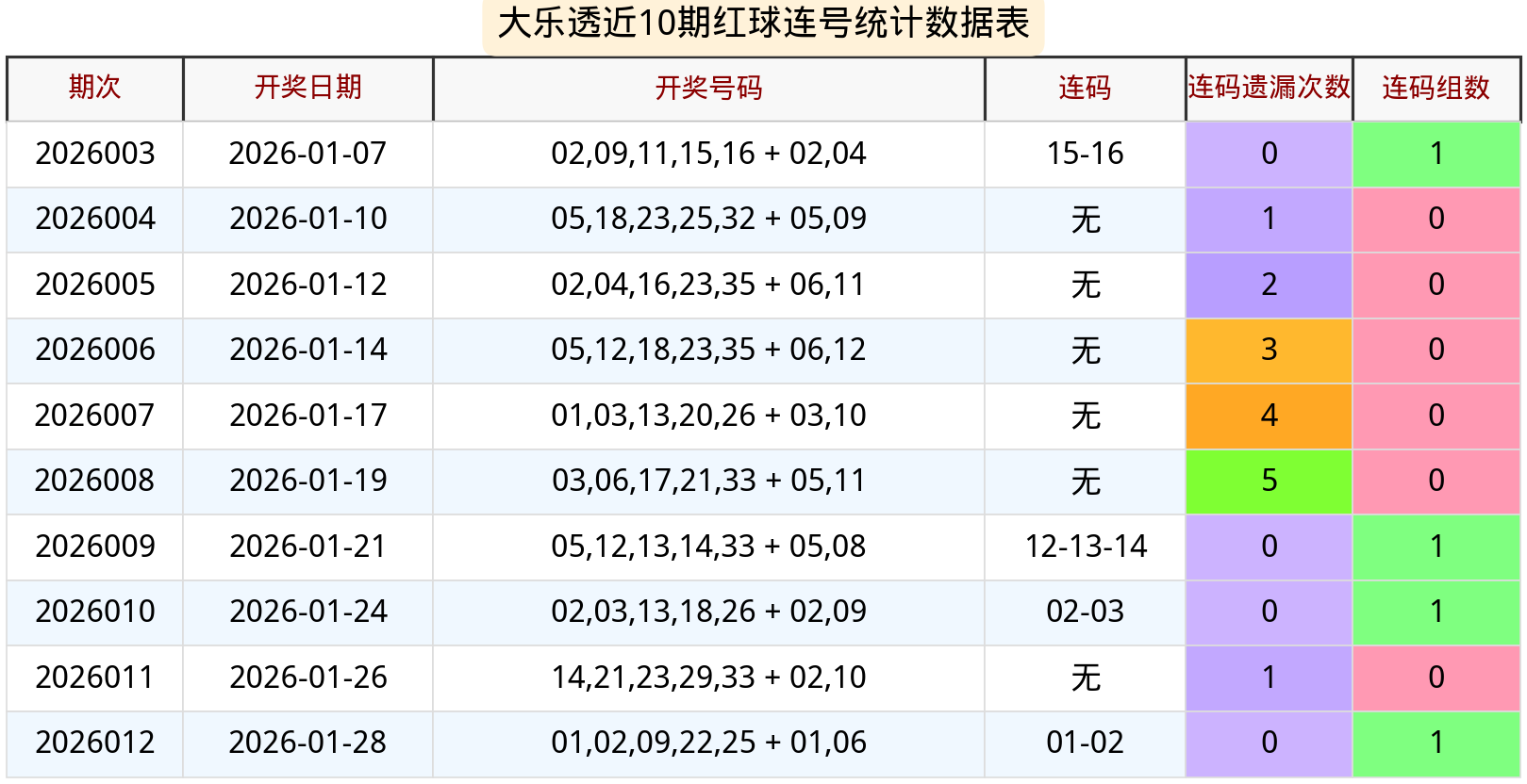 连号:01-02(1组2连),终结此前1期连号空窗,为近5期第3次出现连号;