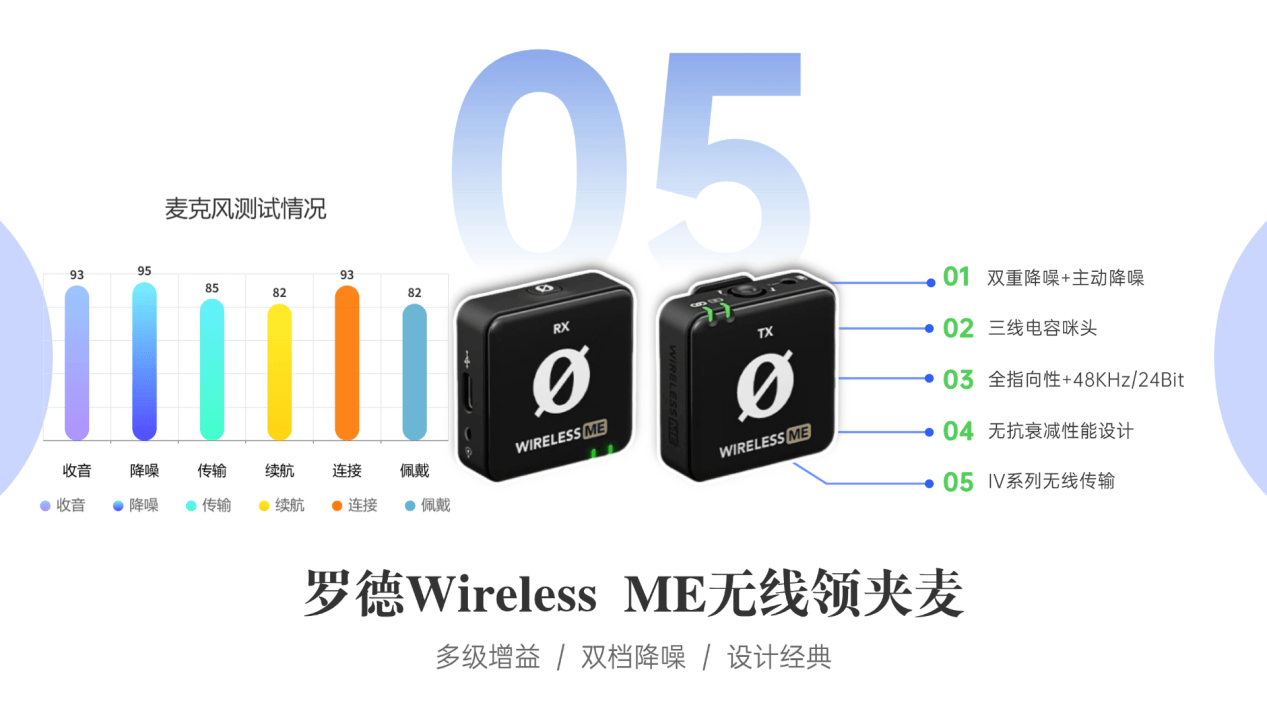 该机型搭载发烧级AI降噪芯片和独创的4重PSNE降噪算法模型,能针对不同频段噪音进行精准过滤,降低96%的环境噪音干扰,同时配备AI抗风噪技术,即使在户外有风环境下也能压制杂音。其发烧级32位浮点数DSP芯片能快速识别噪音类型,瞬间消除环境干扰,录制人声干净自然。罗德Wireless ME的双模式降噪则是面对强弱噪音都能稳定消除。