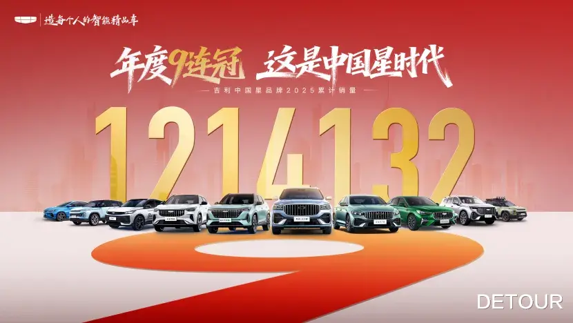 2025年,吉利汽车以超3,024,567辆的年度总销量、39%的同比增幅圆满收官,超额完成年中上调后的300万辆年度销量目标。其中,由星瑞、星越L、博越、帝豪、缤越系列等明星车型组成的吉利中国星矩阵,全年累计销量达1,214,132辆,不仅再次完成逆势增长,更连续9年蝉联中国品牌燃油乘用车销量冠军,为中国品牌燃油车发展树立全新里程碑。在新能源加速渗透的市场环境下,吉利中国星以全矩阵爆款实力筑牢燃油车“基本盘”,成为无可争议的行业标杆,引领燃油市场的价值跃迁。