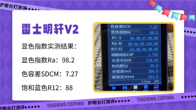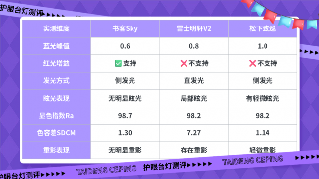 通过实测可以看到,雷士明轩V2在蓝光控制和显色上表现均衡,但直发光带来的轻微眩光和手部重影,在长时间书写时仍会影响舒适度;松下致巡稳定耐用,文字阅读体验良好,但蓝光占比偏高、红光养护有限,对长时间近距离用眼的保护相对基础。