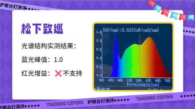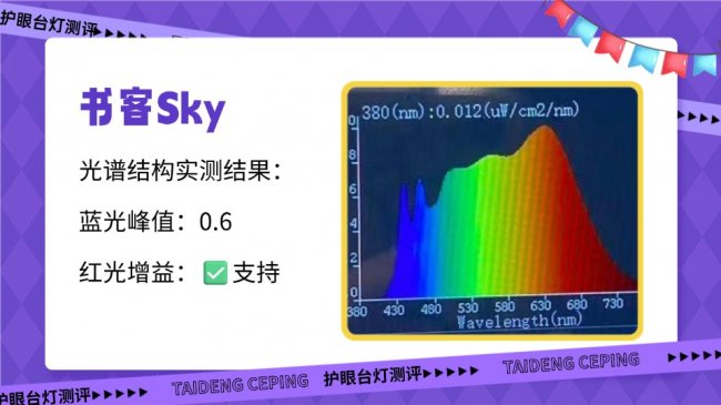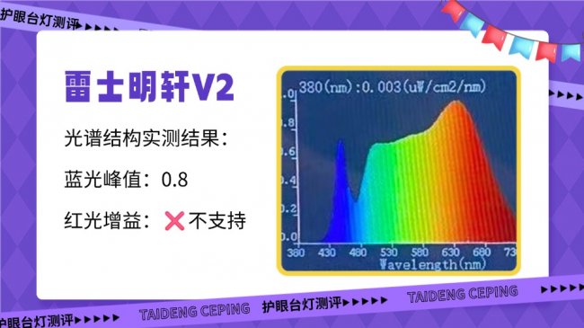 它采用传统蓝光激发全光谱技术,实测蓝光峰值约为1.0,在三款中蓝光占比偏高。同时它的有益红光波段占比较少,整体更偏向基础照明取向,在长时间近距离用眼时,缓解疲劳的能力相对有限。