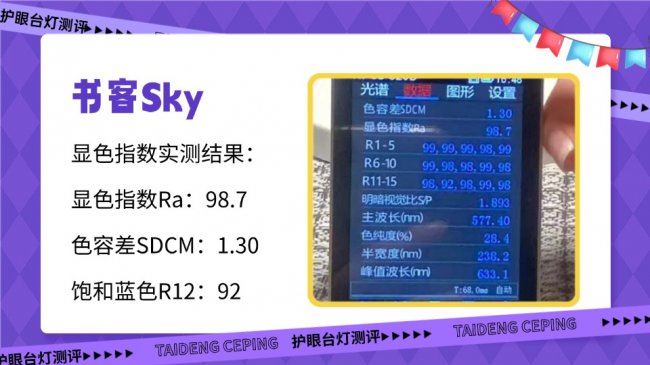 实测显色指数Ra98.2,色容差为1.14,整体色彩还原度和色彩的稳定性都很不错。但饱和蓝色R12仅为77,在蓝色系和冷色调的细节还原上略显不足,更适合以文字阅读为主的使用场景。