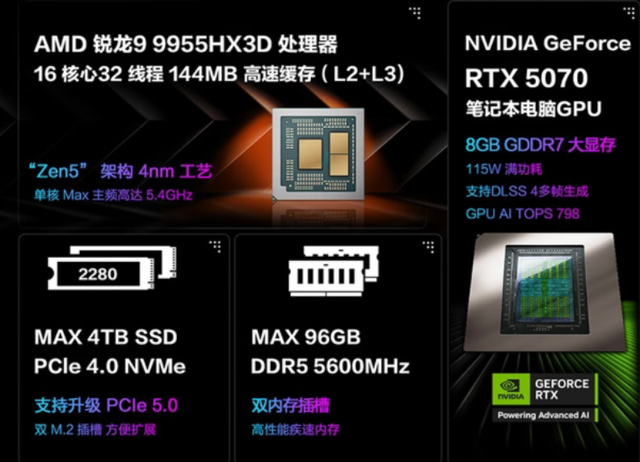 Ryzen 9 9955HX3D基于先进的Zen 5架构,采用第二代3D V-Cache技术,拥有高达144MB 3级缓存与16核32线程的超强规格,在《无畏契约》《CS2》等热门FPS游戏中轻松突破1000帧,即便面对《赛博朋克2077》《黑神话:悟空》等3A大作,也能在2K、1080P分辨率下稳定输出高帧画面。搭配 NVIDIA DLSS 4 与 Reflex 技术,响应更快、画质更真,助你在马年排位如骏马驰骋,一路领先!
