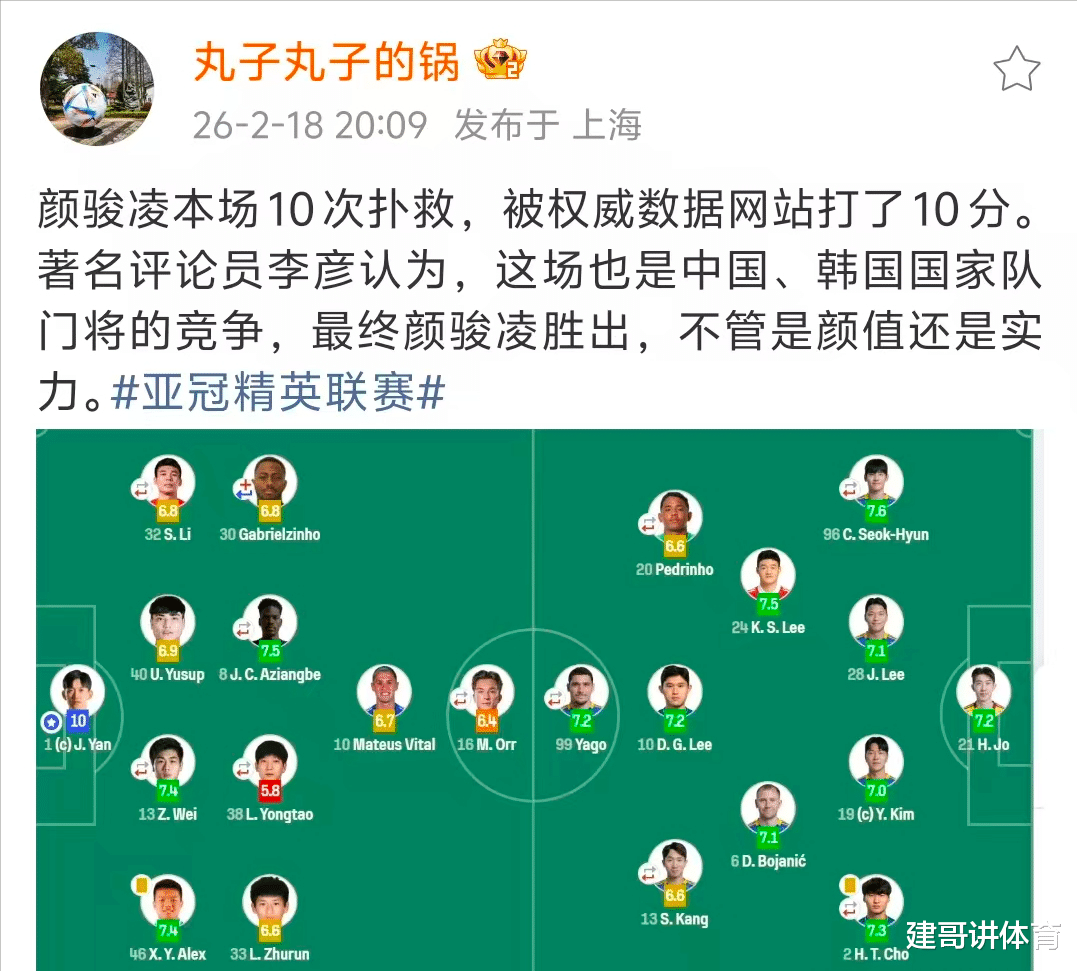 在颜骏凌赛季得到10分的满分评价后,上海媒体记者“蛋炒饭”更是直言“我的偶像是颜骏凌。他自己夸完颜骏凌后,还转述其他知名媒体人对颜骏凌的夸奖:在两队国家队门将的直接对决中,颜骏凌是直接胜出者。颜骏凌这场比赛中的优秀,让中超的知名门将王大雷和薛庆浩和他已经有了明显的差距,这样神勇的门将,估计皇马的库尔图瓦都是望尘莫及的。