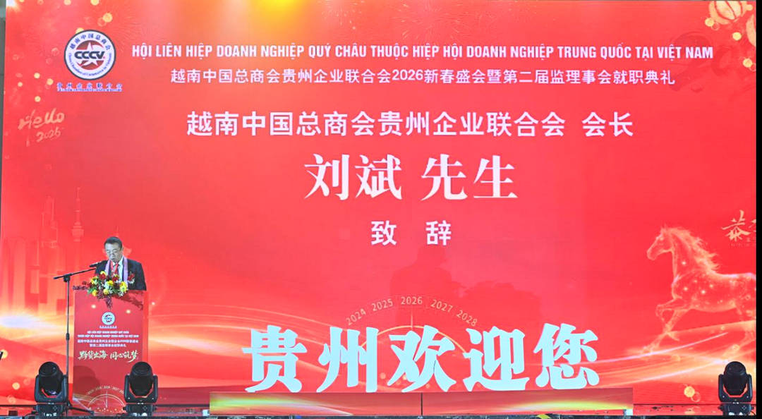 2026年1月3日,以“黔货出海 同心筑梦”为主题的越南中国总商会贵州企业联合会2026新春盛会暨第二届理监事会就职典礼在胡志明市隆重举行,来自中越两国政界、商界、侨界及教育界的600余位嘉宾齐聚一堂,共迎新春,共谋发展。
