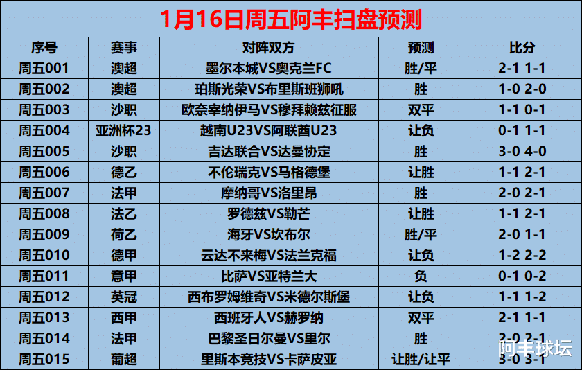 1/16周五赛事前瞻:意甲 比萨VS亚特兰大(内附15场预测)
