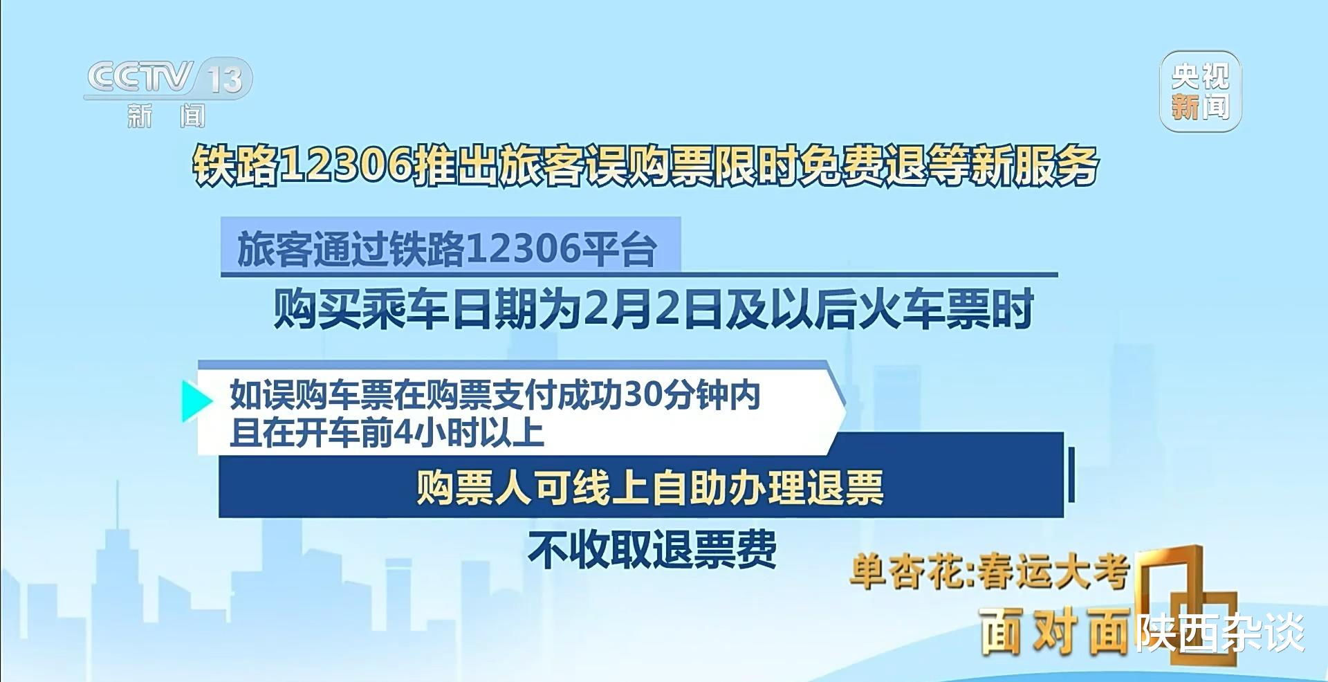 为了进一步提升旅客的购票体验,从1月19日开始,12306平台推出旅客误购限时免费退票的服务,旅客通过铁路12306平台购买乘车日期为2月2日及以后火车票时,如误购车票在购票支付成功30分钟内,且在开车前4小时以上,购票人可线上自助办理退票,不再收取退票费用。
