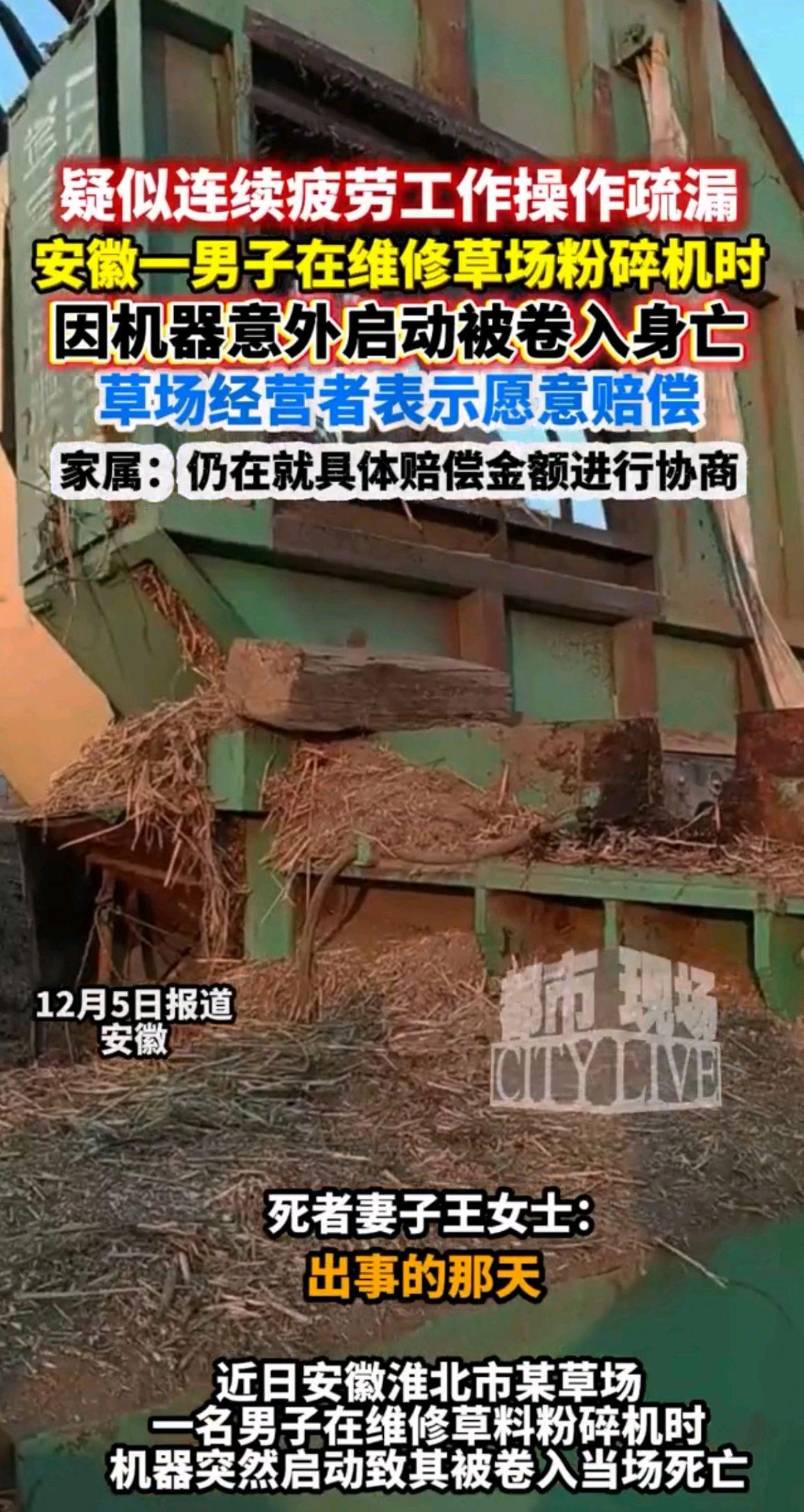 11月20日,安徽淮北某草场内,37岁的王百忍在维修堵塞的粉碎机时,随身携带的遥控器意外触发。1800转/分的刀片瞬间将他吞噬,消防员拆解机器后仅寻获部分残肢,人体组织与草料混合的场景令人窒息。更令人心碎的是,这场惨剧被66岁的母亲全程目睹——她看着儿子被机器绞碎,却无力阻止。