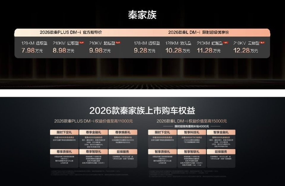 1月8日,比亚迪秦家族迎来加推,2026款秦L DM-i /2026款秦PLUS DM-i 210KM长续航版双车同步上市,售价8.98-12.28万元。其中,2026款秦L DM-i 210KM长续航版限时超级优享价11.28-12.28万元,2026款秦PLUS DM-i 210KM长续航版售价8.98-9.98万元。同时,两款车型均带来了丰厚的上市权益礼。