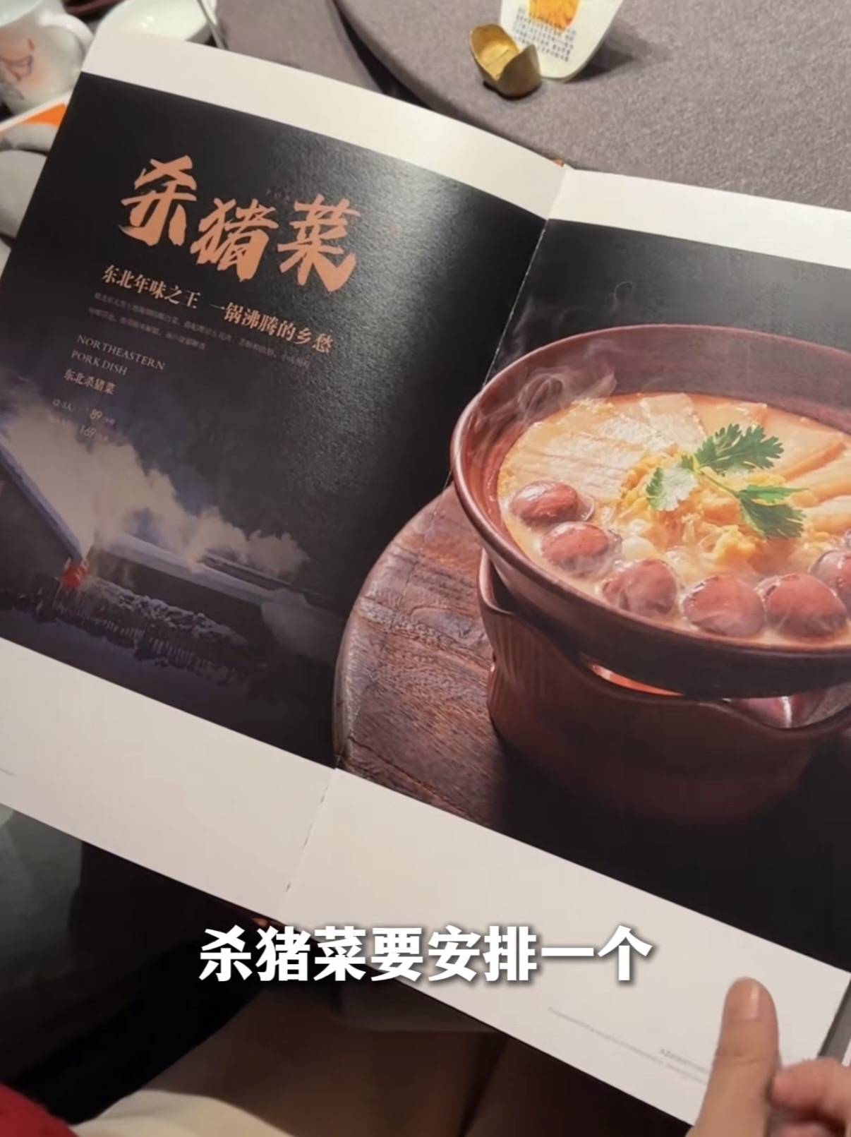 他们点了哈尔滨红肠、有机酸菜炒海肠、杀猪菜、锅包肉、大拉皮、黑蒜红烧肉、铁板大连鱿鱼、黄豆酱大肠等菜。