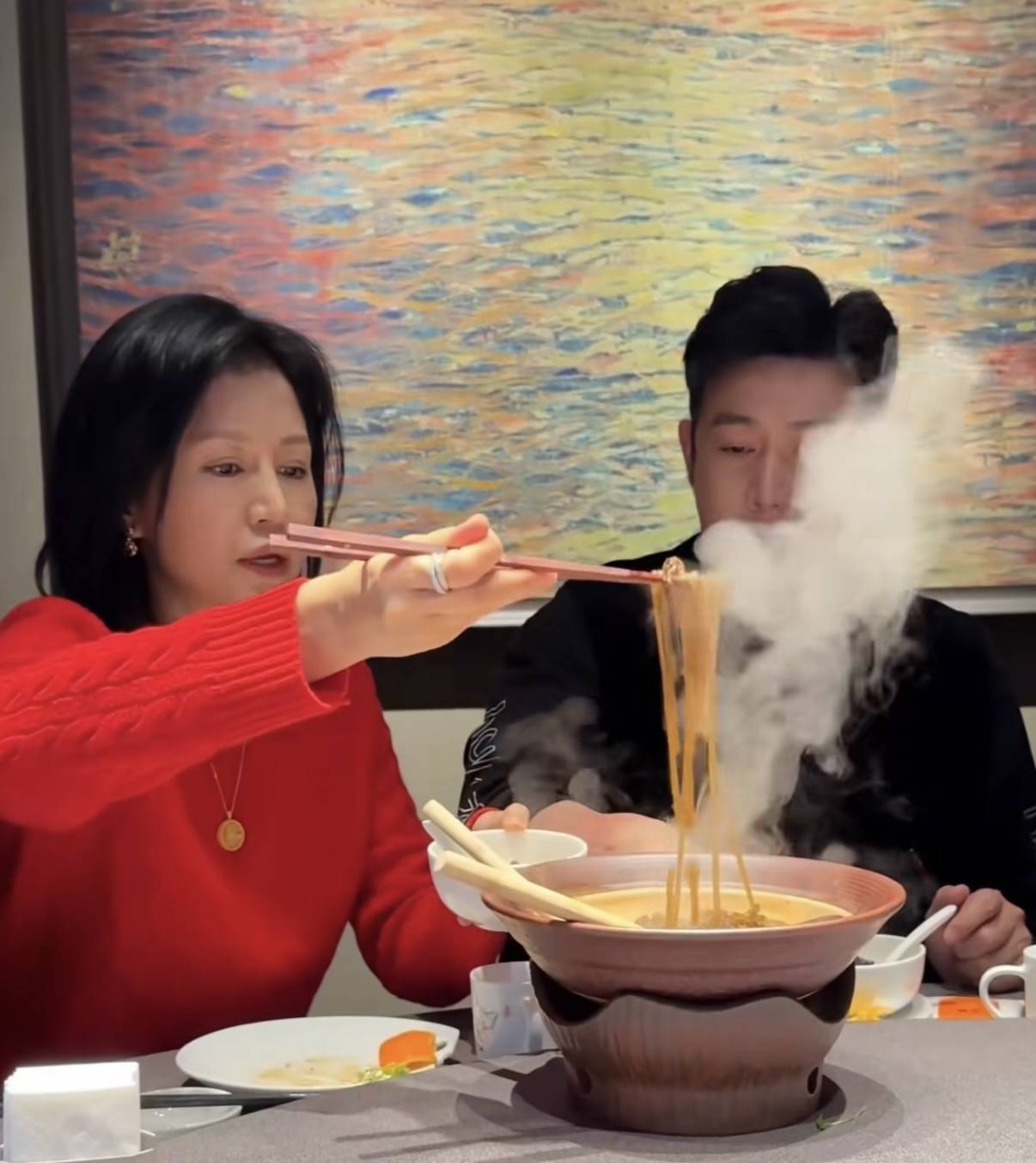 热气腾腾的杀猪菜,还有白菜粉条。鲍蕾帮着陆毅盛了一碗,夫妻俩感情是真好。虽然鲍蕾不太允许陆毅点菜,主要也是为了一家人控制身材,不能吃的太油腻、太甜之类的。