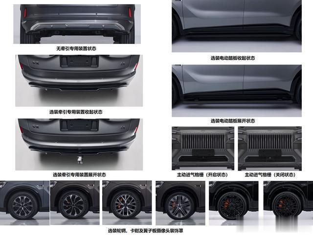 外观设计:极氪8X前脸大体延续极氪9X的设计语言,采用直瀑式大嘴格栅与分体式大灯,车顶配备激光雷达。车身侧面线条流畅,车顶略带下坠,窗线扬升,搭配大尺寸轮毂与镀铬装饰。车尾部分,车顶有大尺寸扰流板,尾箱线条立体,贯穿式尾灯简洁时尚,后保险杠有银色装饰。此外,申报图中还有多种熏黑样式,增添了运动气息。