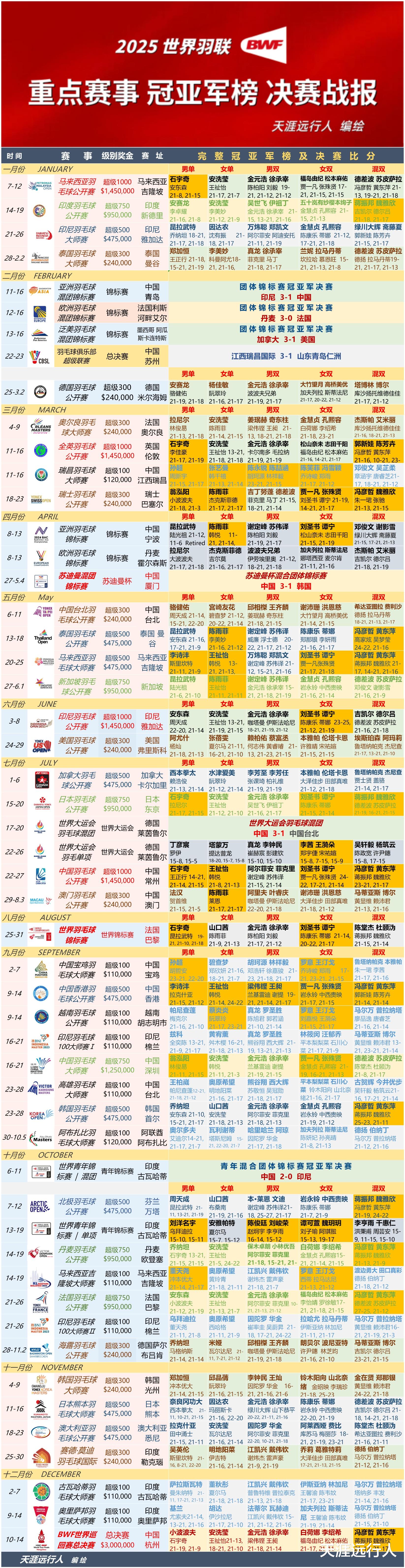 2025世界羽联巡回赛重点赛事冠亚军排行榜+决赛战报全记录