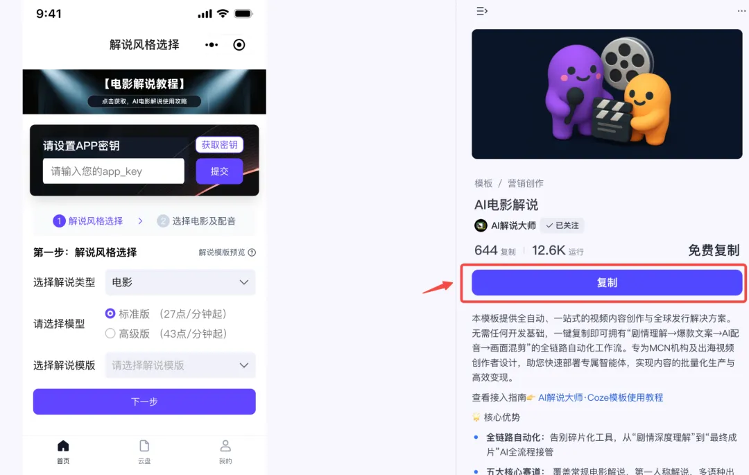 打开扣子官网,去【模板商店】搜 “AI电影解说”。 看到那个紫色的按钮了吗?别犹豫,点 【复制】。