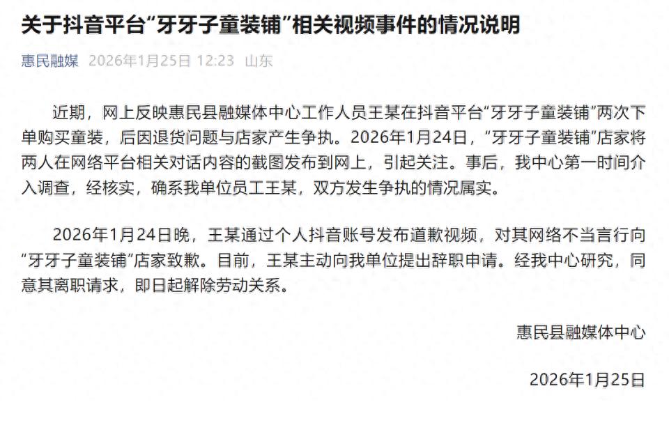 近期,网上反映惠民县融媒体中心工作人员王某在抖音平台“牙牙子童装铺”两次下单购买童装,后因退货问题与店家产生争执。