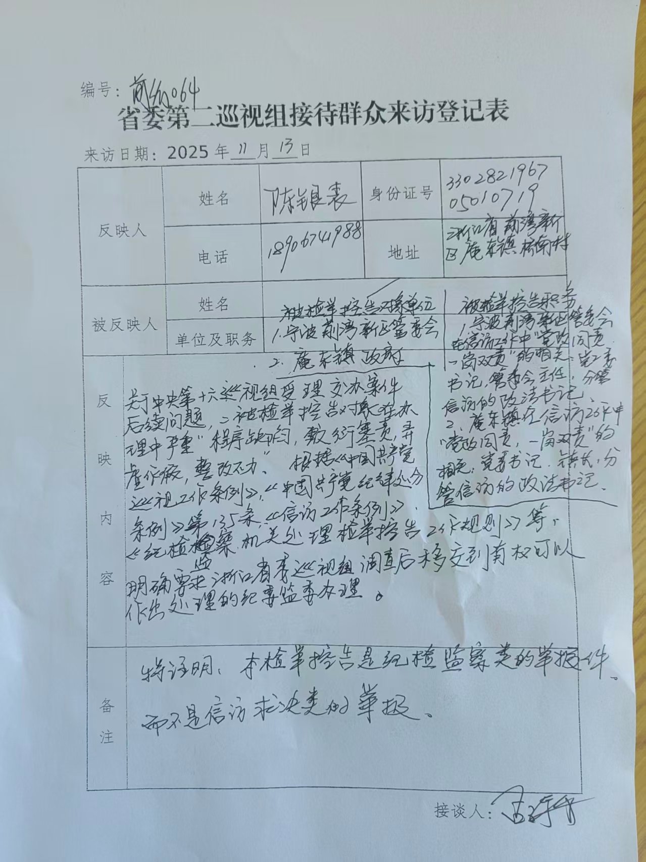 目前,他已向浙江省委巡视组提交材料,等待依法核查。相关政府部门尚未公开回应。