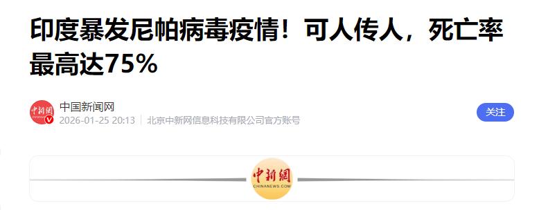 1月26日,据新华社消息,印度东部的西孟加拉邦近期出现尼帕病毒感染病例,目前已有5例确诊病例。