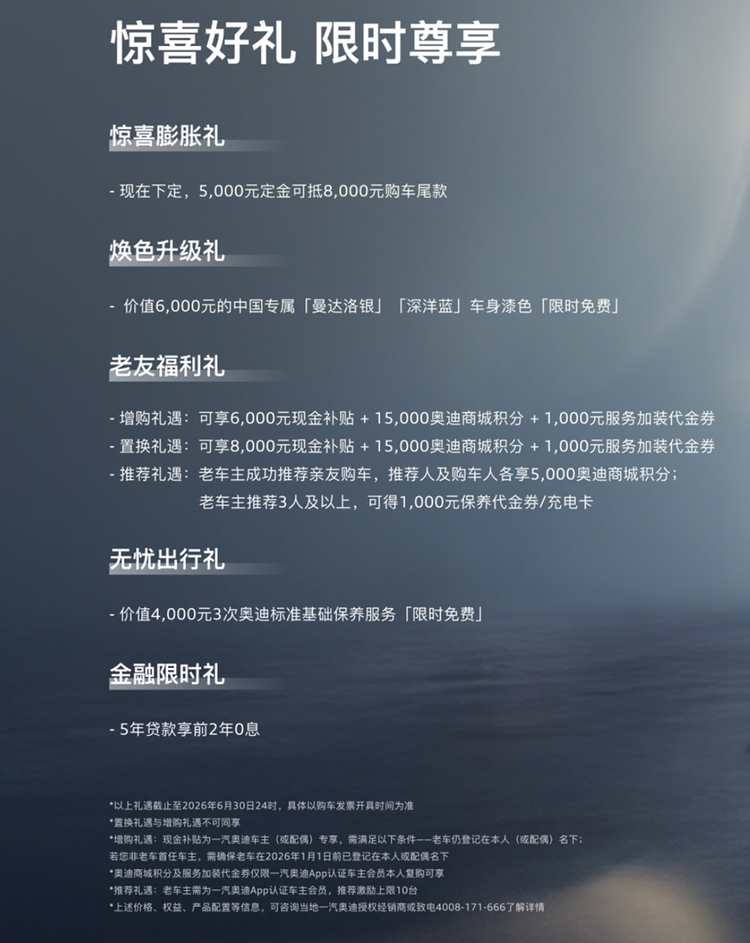 面对国产高端新能源对传统豪华市场的冲击,一汽奥迪并未固守“品牌溢价”的老路。官方推出的5000元抵8000元购车尾款、增购6000元现金补贴、置换8000元现金补贴、5年贷前2年0息等政策,精准契合了中国豪华市场的用户期待,将诚意定价和丰富权益有机结合,展现出了更贴近市场、更尊重用户的务实风格。