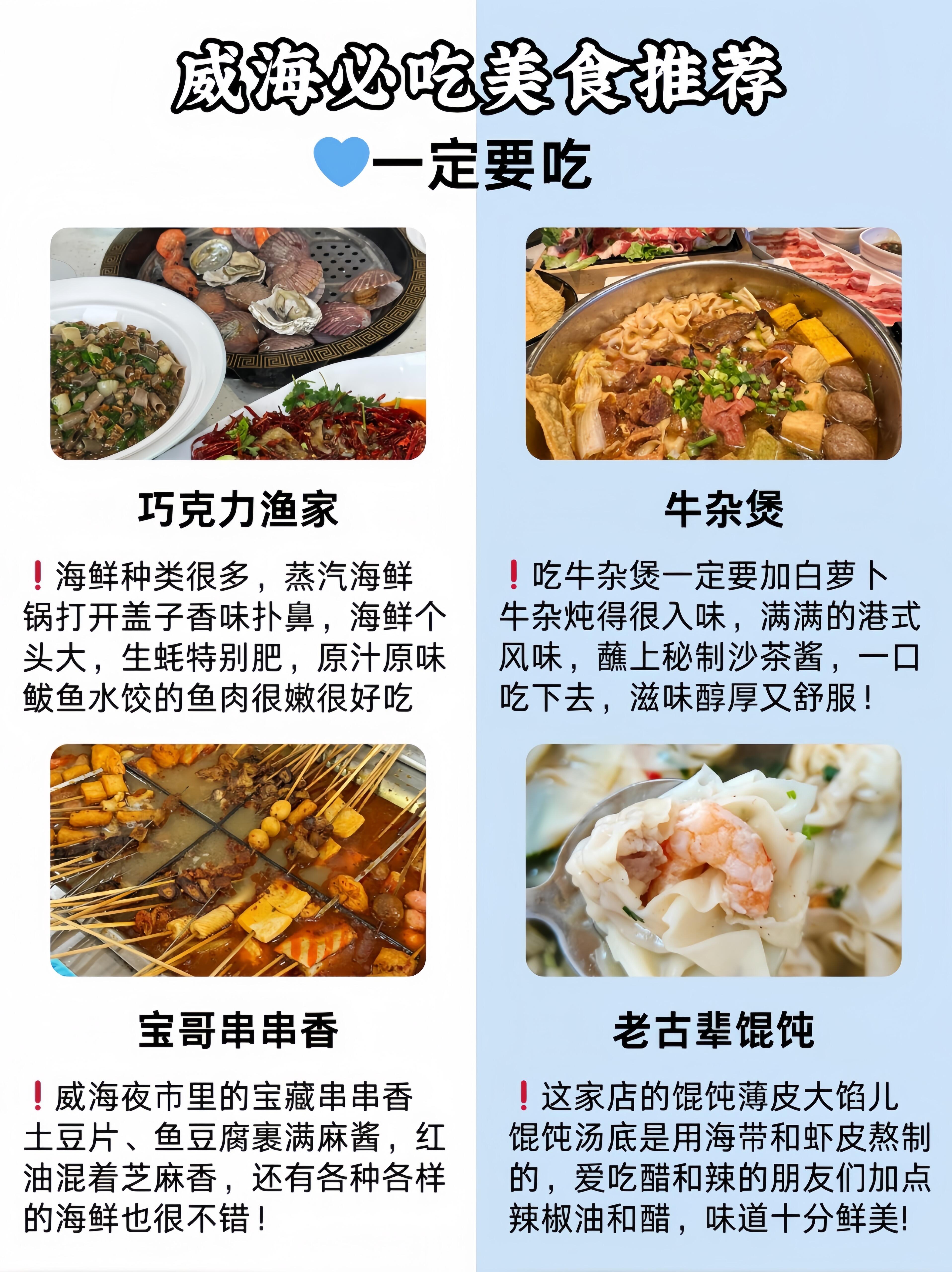 ✅巧克力渔家的海鲜确实不错,非常新鲜,收拾得也干净,都是现捞现做的。海鲜蒸汽锅要点,🦐虾是活蹦乱跳上来蒸的,味道是原汁原味的!还有✅牛杂煲和✅老古辈馄饨也很不错!都是威海的特色美食!✅宝哥串串香是威海夜市上的美食,吃着很过瘾😋