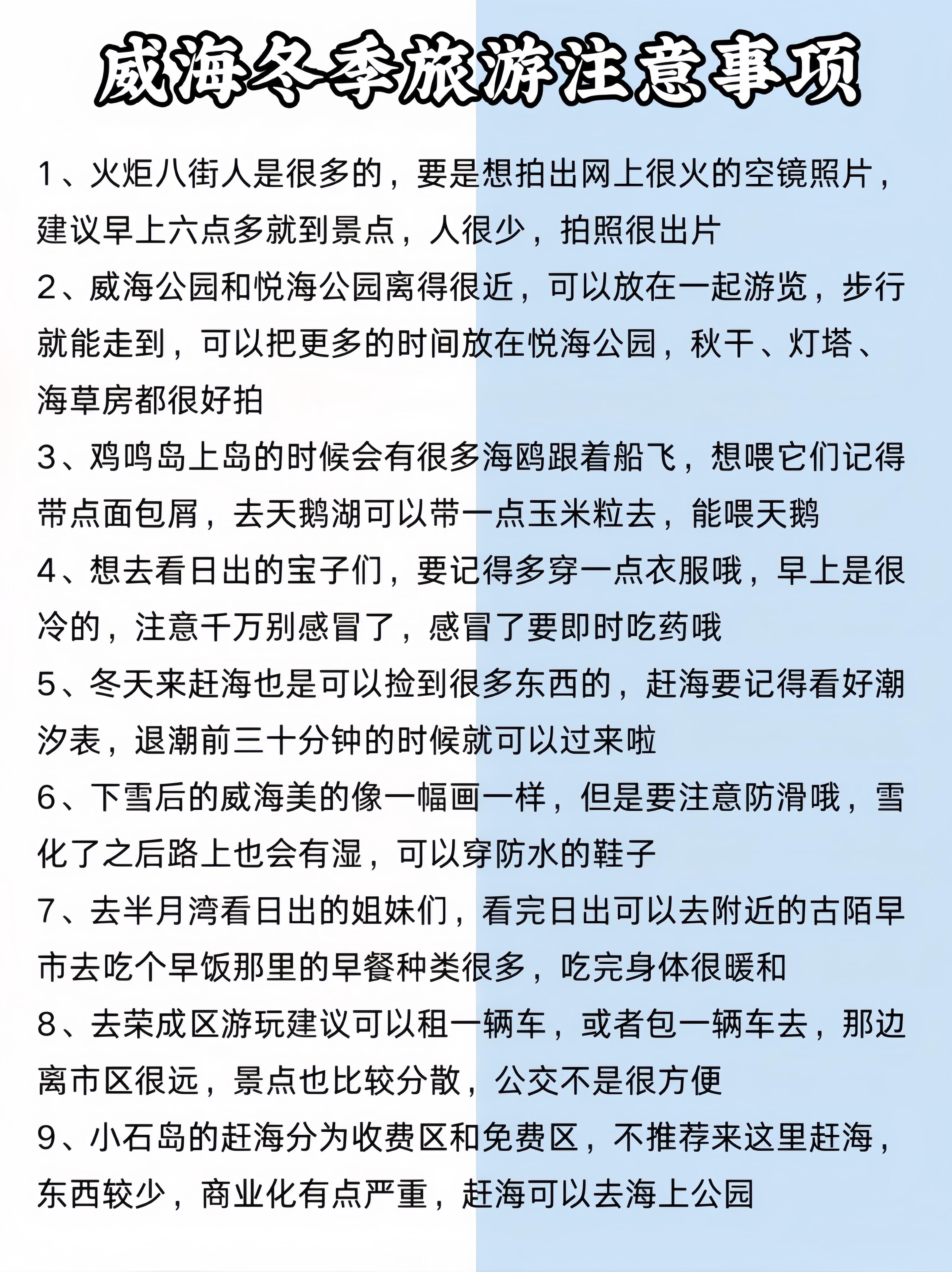 冬天来威海一定要💡穿厚点,手套🧤帽子🧢都是BiBei的,手机贴暖贴防冻关机,威海下雪很冷的❄️🐟订酒店之前🏘️要先确认有没有暖气,冷的话也可以问老板多要被子。🦞吃完海鲜别马上吃冰的,特别是肠胃敏感的,可以备点常用药。📸雪后上午10点前、下午3点后拍照好看。✈️威海大水泊机场,离市区约40分钟车程
