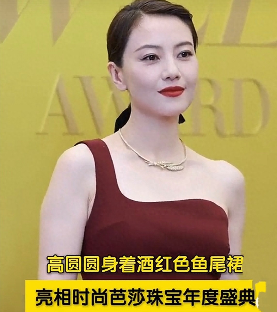 当晚,高圆圆身着一袭Safiyaa酒红色鱼尾裙惊艳登场。酒红色,这一充满浓郁韵味与高贵气质的色彩,在她身上被演绎得淋漓尽致。鱼尾裙的设计巧妙地勾勒出她曼妙的身姿,流畅的裙摆线条如灵动的音符,随着她的步伐轻盈摇曳,每一步都仿佛踏在时尚的节拍上,尽显优雅与从容。裙身的剪裁精致细腻,贴合身体曲线的同时又留有恰到好处的空间感,既展现了女性的柔美曲线,又不失大气与端庄。
