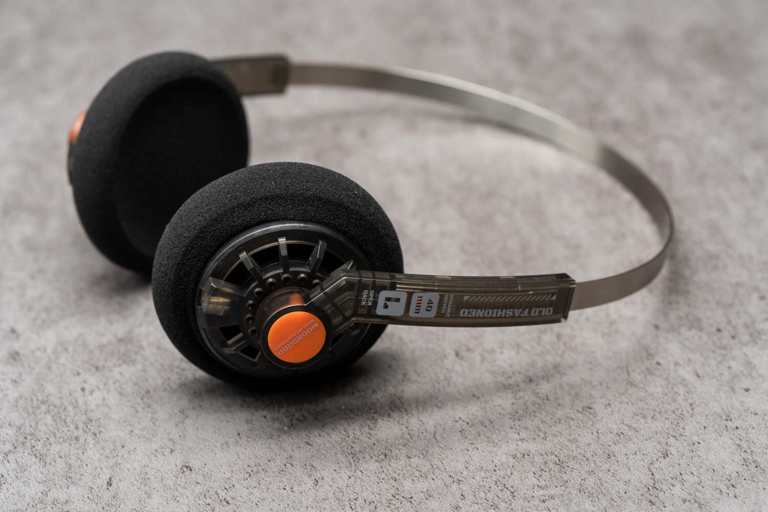 外观特征:复古经典动圈小头戴结构,“薄铁片”式头梁,灰橙复古配色和半透明设计