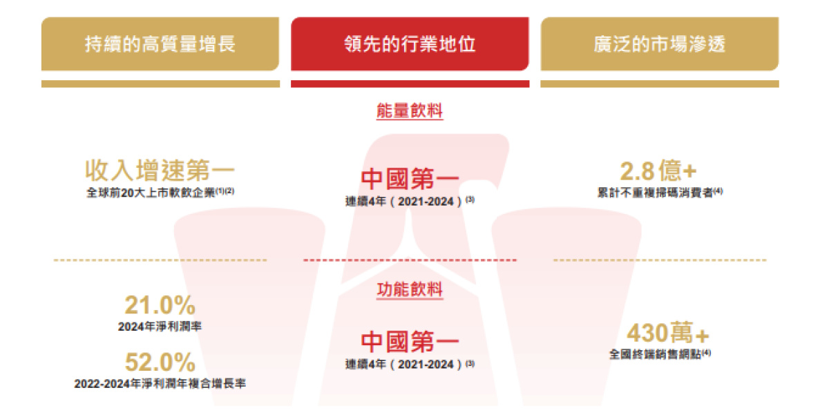 招股书显示,按销量计,东鹏饮料自2021年起连续4年位居中国功能饮料市场第一,市场份额从2021年的15.0%提升至2024年的26.3%;按零售额计,2024年以23.0%的市场份额位列行业第二,收入增速在全球前20大上市软饮企业中排名第一。