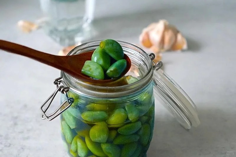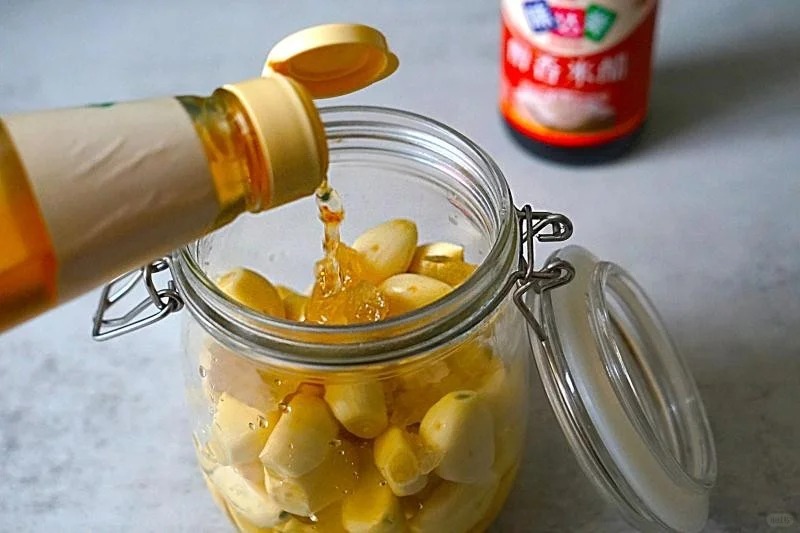食材:500 克蒜头、550毫升米醋或者陈醋都行、 10 克冰糖、20毫升白酒、盐 1 勺